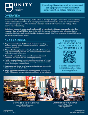 Unity Prep invites prospective families from schools across Brooklyn to join us at an upcoming Unity Prep Open House. Listed below are both in-person and virtual meeting dates.
