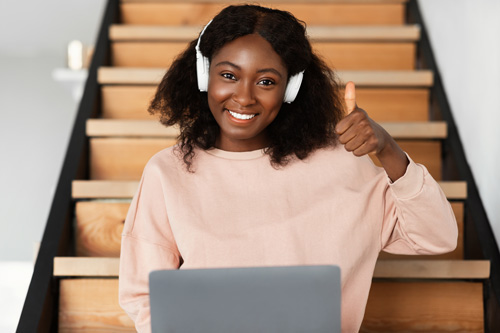 black-female-using-laptop-gesturing-thumbs-up-sitting