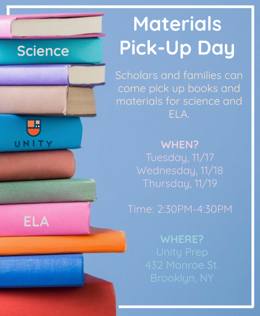 We are distributing books and materials for Science and ELA classes next week. Scholars and families can pick-up materials on Tuesday (11/17), Wednesday (11/18) and Thursday (11/19) at 2:30pm-4:30pm.