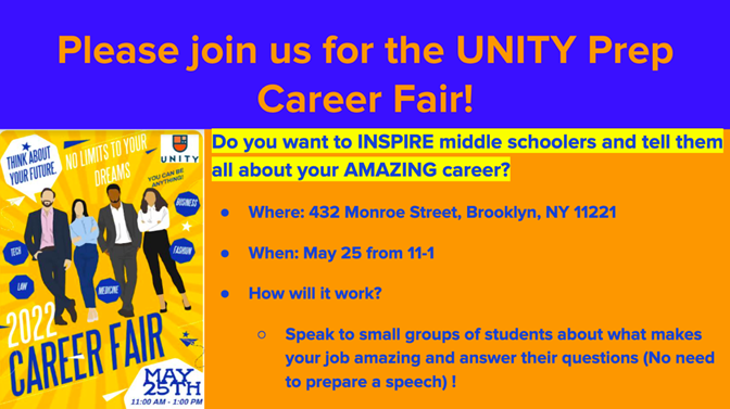 2. New – Take Part in our Career Fair for Unity Middle School Students, Wednesday, May 25th, 11am-1pm!: We are excited for our middle school students to be inspired by the many career paths available to them in the not-so-distant future! We would love to have family members of our students participating as presenters (see the flyer below). Interested in learning more and potentially taking part? Contact Ms. Gillies (agillies@unityprep.org).
