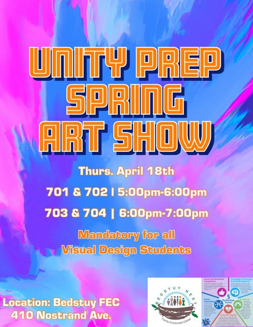 New – Unity’s Middle School Spring Art Exhibition, Thursday, April 18th, 5 & 6pm!: Under the guidance of their Art & Design Teacher, Mr. Berkeley, Unity’s middle school art students will proudly exhibit their latest artwork on Thursday, April 18th. All art students are required to participate, and we welcome all of our students and families to attend and celebrate our young artists and their latest creations! See the flier below for details and note the address – we are excited for our students to show off their latest works in a real exhibition space within the local community!
