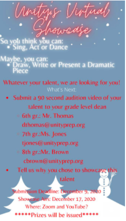 - Recap –Unity Middle School’s Virtual Showcase, Thursday, December 17th: Unity students of all grades will be able to showcase their talents for the entire school community! Students should email a 90-second video clip (or less) to their grade level dean by December 9th–see below for more information! Prizes will be awarded to select performers!