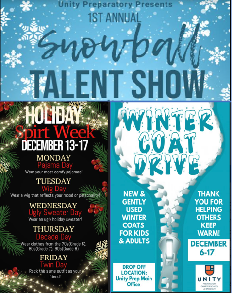 2. New – Exciting Events at our Middle School this Month!: December will undoubtedly be a spirited month for middle school students with three big events in the mix, including a talent show, Spirit Week, and coat drive. Details are provided in the flyer below!