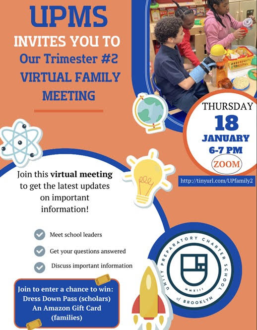 1. New – Attention: Families of Unity Middle – Trimester 2 Family Virtual Meeting is Next Thursday, January 18th, at 6pm: All families are strongly encouraged to participate in next Thursday’s meeting so that you are fully informed on current events and initiatives. Details are provided in the flier below.