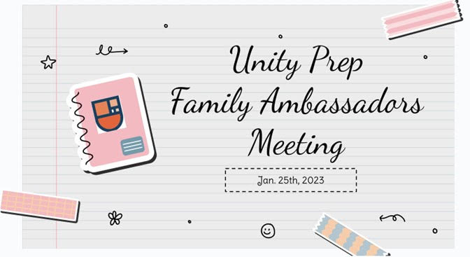 1. New – Thank you, Families, for Taking Part in Last Thursday’s Family Ambassadors Meeting!: We are grateful to our families who participated in our Family Ambassadors meeting on Zoom last week. The meeting was productive, energizing, and, of course, fun! Here are the slides from the meeting. Contact Mr. Beckford with questions. Unity’s Family Ambassadors will meet again on Thursday, February 8th, at 6pm – all families are encouraged to attend.