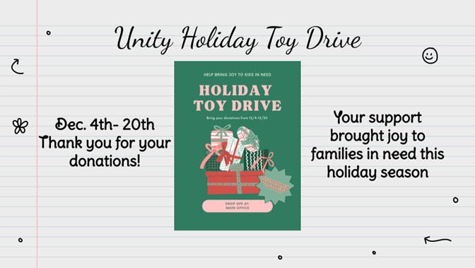 In this edition of The Unity Scoop, we honor the generosity of our school in engaging in a number of community service initiatives before the winter break. We also celebrate our students with stellar attendance from the month of December. Finally, we promote a community event at The Brooklyn Academy of Music happening next weekend in tribute to Dr. Martin Luther King, Jr. and his legacy.