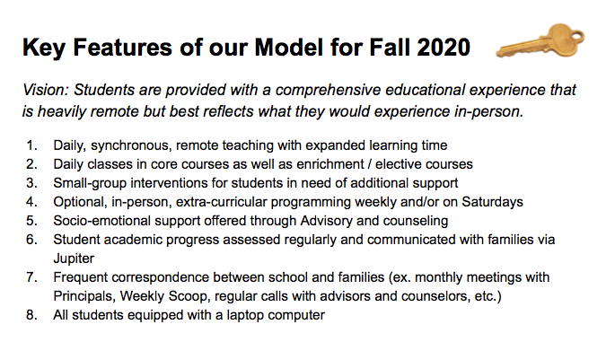 I want to thank all of our families and students who participated in Tuesday’s Family Forum to learn about our plan for the 2020-21 school year and their contributions. In case you missed it, here is the recording and here are the slides from the Forum. I also share below some of the highlights of the Forum and what was presented. I encourage you to watch the recording as well as review the slides and updates below.