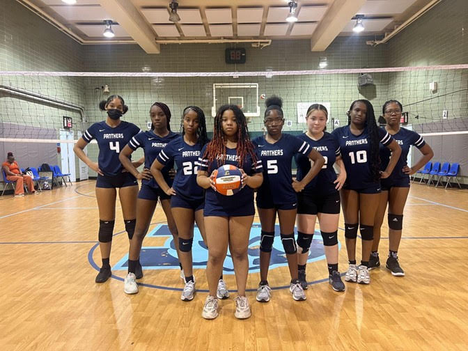 Members of the middle school volleyball teams before a recent match (clearly with the game faces on!)