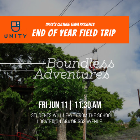 7. Recap – End-of-Year Trip for Unity High Students!: On Friday June 11th, Unity High students have the opportunity to have fun with classmates at Boundless Adventure Aerial Park in Purchase, NY. Activities include completing low ropes courses, high ropes courses, and air obstacle courses. Participating students will travel to the park by bus, enjoy a catered lunch, and bond with classmates one last time before the school year ends. RSVP now via Jupiter. For more information, reach out to Mr. Lopez or Ms. Jaquez. HEALTH SAFETY NOTE: While on the coach bus, each student will have their own seat as set forth by social distancing guidelines & Department of Education regulation. Students will be required to wear a mask at all times while on the bus and submit to a health safety screening upon entry to the bus.