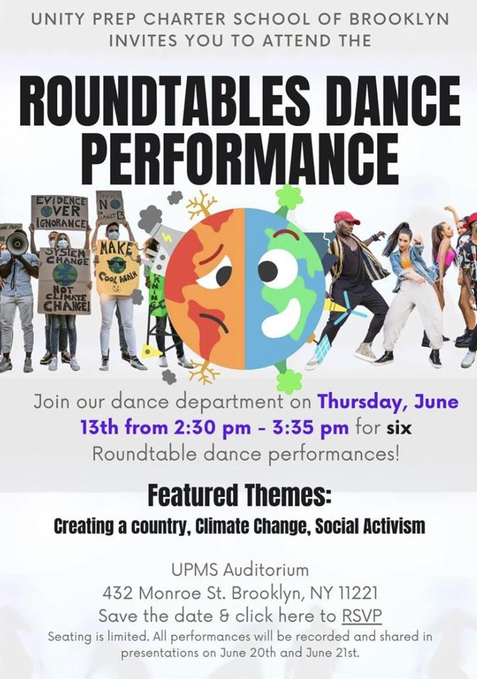 New – Unity Middle’s Roundtable Dance Performances – Come See Them Live!: Our dance students will be filming their Roundtable dance performance this coming Thursday, June 13th. Join us in our middle school auditorium from 2:30pm to 3:30pm to see the performances live. See the details below and RSVP here!