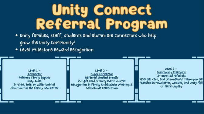 Help our small and mighty Unity family grow — and earn rewards while you do! When you refer a new family who applies for the 2026–27 school year, you’ll earn Unity Connector Rewards like Unity swag, gift cards, and special recognition at Unity events.