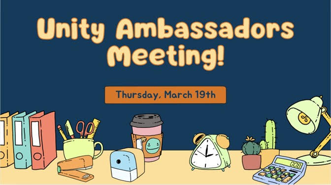 We invite all Unity families to join us for our upcoming Family Ambassadors Meeting on Thursday, March 19th, at 6pm on Zoom. This is a great opportunity to connect with fellow families, share ideas, and help strengthen our school community. We look forward to seeing you there!