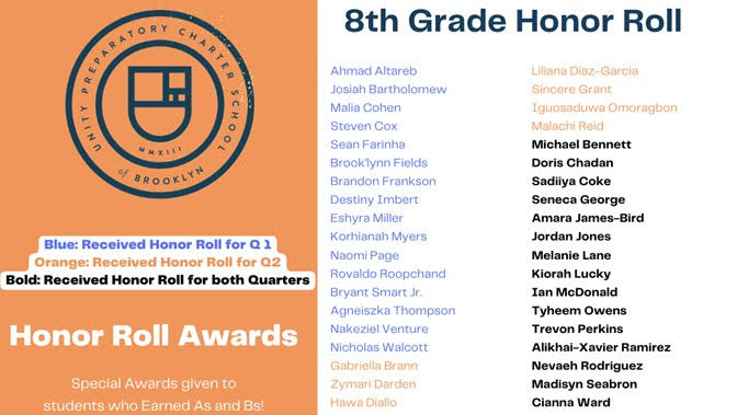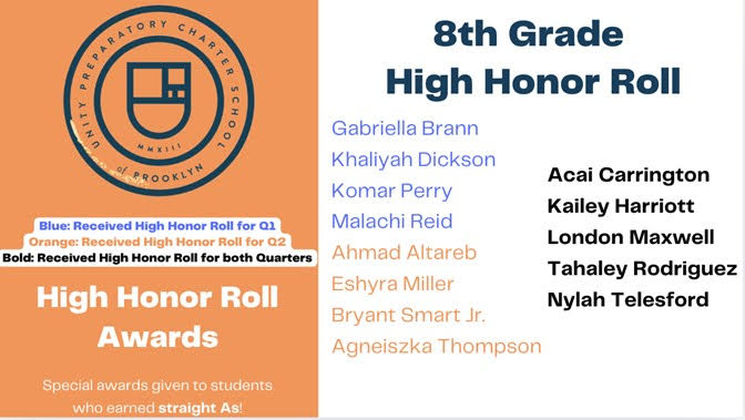 2. New – Congratulations to our Middle School Honor Roll Students for Semester 1! Congrats to our students in grades 6-8 who earned Honor Roll status in the first semester of the school year! Your consistent hard work, organization, and eagerness to learn things and develop new skills is paying off. Be proud of your accomplishments and stay the course!