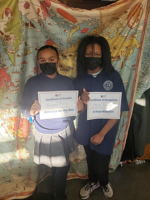 1. New – Students and Teachers in Action this Week: This week, we spotlight our young historians as they collaborate, research, present their findings, and shine.  Students in grades 6-8 this week presented their recent research projects in class.  Research topics included provocative historical questions, such as: whether the American Revolution was indeed revolutionary, to what extent was Reconstruction era a success, and how WWII should be remembered.  In the first photo below, Christopher M. takes a moment to pose for a quick photo op before presenting his research.  In addition, the middle school history department recently celebrated the academic accomplishments of a number of students –  the second photo shows Azzahra M. and Melody B. accepting their awards as “Top Historian” and “Historian on the Rise,” respectively.