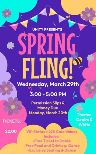 7. New – Spring Fling Dance at Unity Middle on Wednesday, March 29th, 3-5pm!: Our middle school Spring Fling Dance is happening this coming Wednesday afternoon! To attend, students must have a permission form completed by a caregiver. Tickets are $2 and may be purchased at the door on the day of the event.