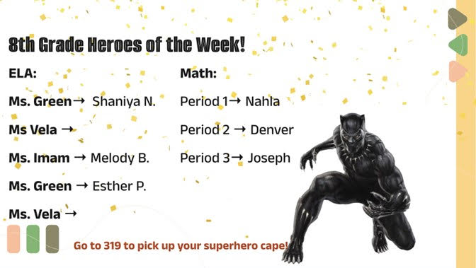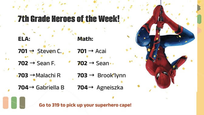 New – We Continue in our Celebration of our Weekly Test Prep Heroes!: As we prepare for students to shine on this year’s state exams (and do so in engaging ways), our middle school community is celebrating the efforts of select students each week. See the slides below for last week’s Test Prep Superheroes. We look forward to celebrating students again this week for their efforts!
