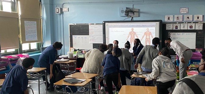 2. New – Students and Teachers in Action this Week: We are thrilled to continue celebrating the hard work of our students as they engage in their learning each and every day. This week, we spotlight our middle school scientists-in-training. Sixth grade scientists have been exploring different body systems and their functions. Scholars are learning how these human body systems are all interconnected and dependent on one another. In the attached photo, Ms LaPlaca, Mr Thomas, and our scholars are playing a quick game of “Ms. LaPlaca says” to learn about the different muscles in the human body.