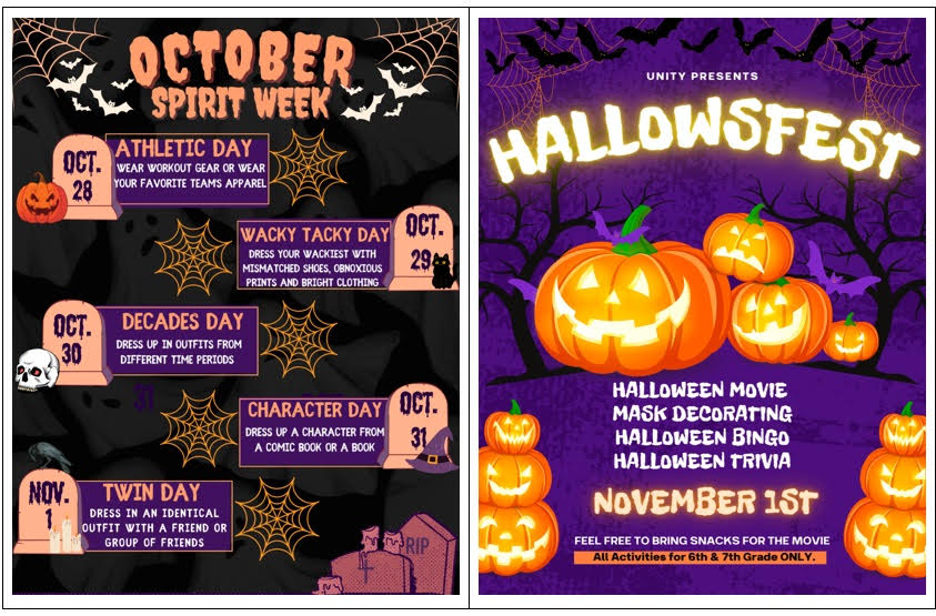 7. Updated – Fall Spirit Week is Just Around the Corner!: See the fliers below for Unity’s Spirit Week and Annual Hallowsfest Extravaganza during the Week of October 28th!
