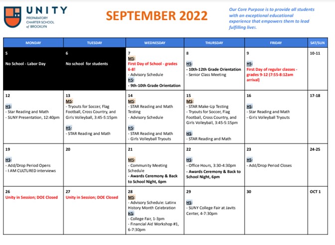 10. Recap – Unity Applied for its Charter Renewal in August: As a charter school, Unity must apply to reauthorize its charter at the end of each term. We opened our doors in 2013, and earned a full 5-year renewal (the longest possible term) in 2018. We are now in our last year of that term and submitted our application to the New York State Education Department (NYSED) for renewal in August with the goal of earning another 5-year term. There will be site visits from state officials and public hearings before the Board of Regents votes on our term in the spring. We will be sharing updates from our renewal and soliciting feedback from our families in the coming weeks!