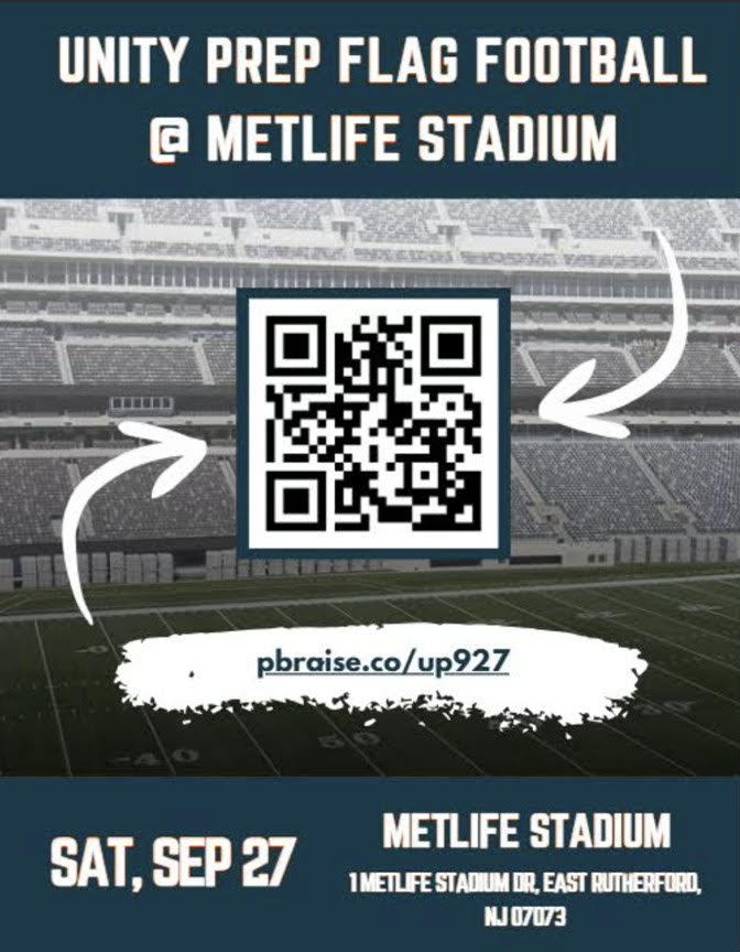 11. Recap – Athletics Enrichment Beyond the Court and Field at Unity!!: On Saturday, September 27th, our Annual Student vs. Faculty Flag Football Game will take place at MetLife Stadium! Our students will have the incredible opportunity to compete on an actual NFL field, with kickoff at 5:35 p.m. This event also serves as a fundraiser for our athletic department, and we encourage families to join us, cheer on our Panthers, and support the Unity community. See the details below—including a QR code for purchasing tickets!
