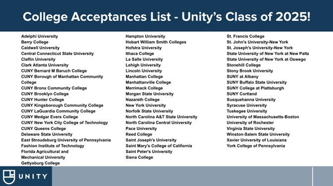 14. Recap – College Acceptance List for Unity’s Class of 2025!: We are excited to share with our community the full list of colleges to which Unity’s Class of 2025 have earned admission. Congrats to the entire class and their families as they now decide which college they will attend this fall!